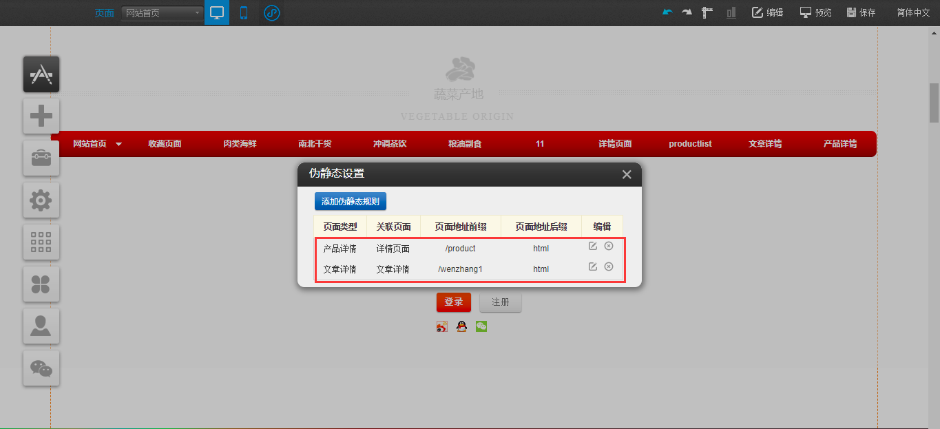 1.以PC版为例,首先在建站编辑器中点击“设置”-“伪静态”-“添加伪静态规则”,选择页面的类型“产品列表”或“文章列表”,进行伪静态的设置,设置完成后点击“保存”,然后在编辑器中拖入“文章分类”或“产品分类”,点击“设置”,将分类链接页面与在伪静态设置中的页面选择一致即可,然后点击保存,如图所示: